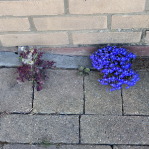 The somewhat stunted little plant on the left is a dandelion, almost at the end of its life. The blue plant on the right is Lobelia, a popular bedding plant here in England. Both probably grew from airborne seeds that settled in the cracks in the paving and sprouted when it rained. With no people walking past and no maintenance on the property, they grew.